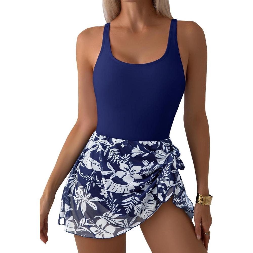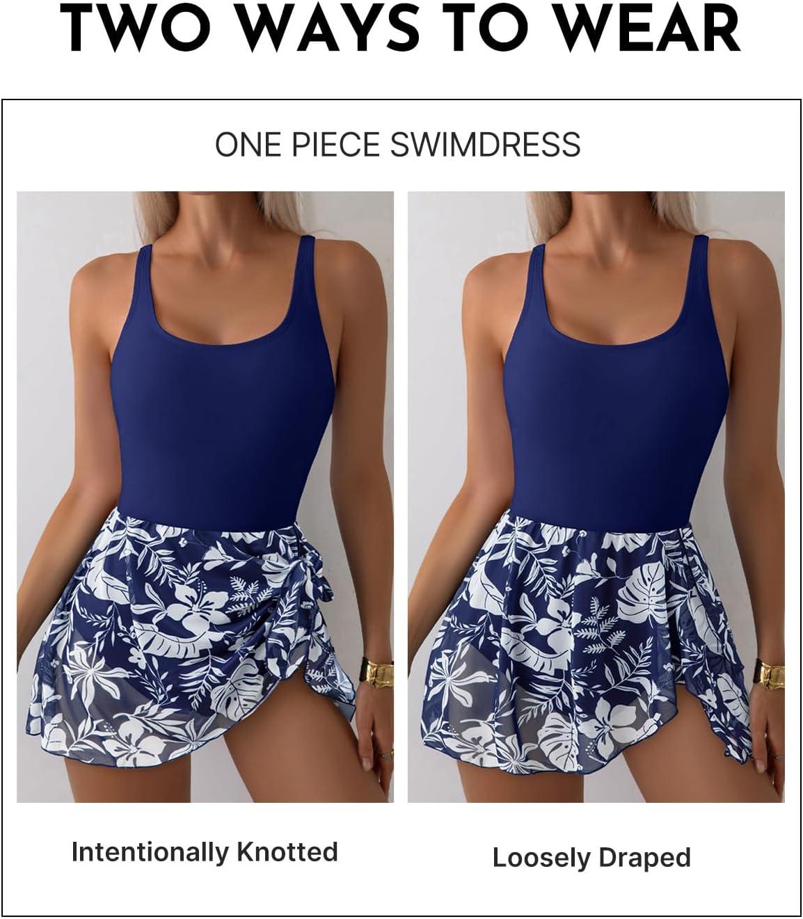 Aleumdr One Piece Swimdress Swimsuit for Women Tummy Control with Mesh Skirt Tie Knot Swim Dresses Bathing Suit(Navy Blue)