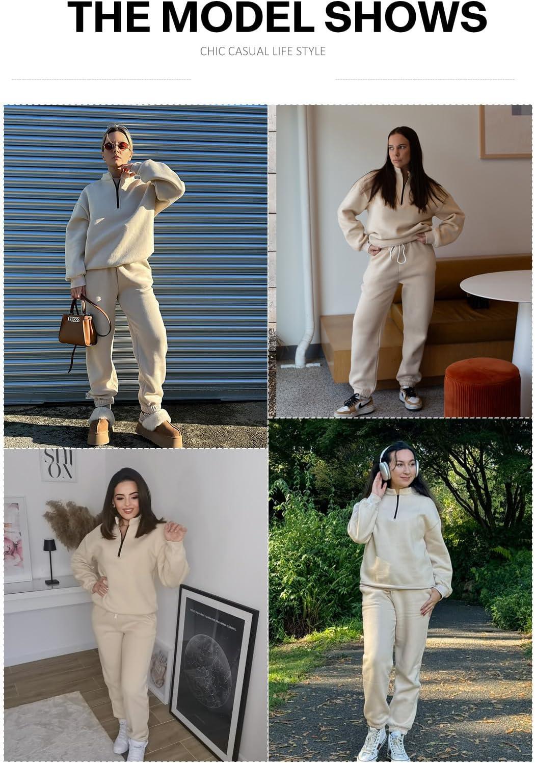 Aleumdr Women 2 Piece Outfits Sweatsuit Oversized Half Zip Pullover Long Sleeve Sweatshirt Jogger Pants Set with Pockets(Apricot)
