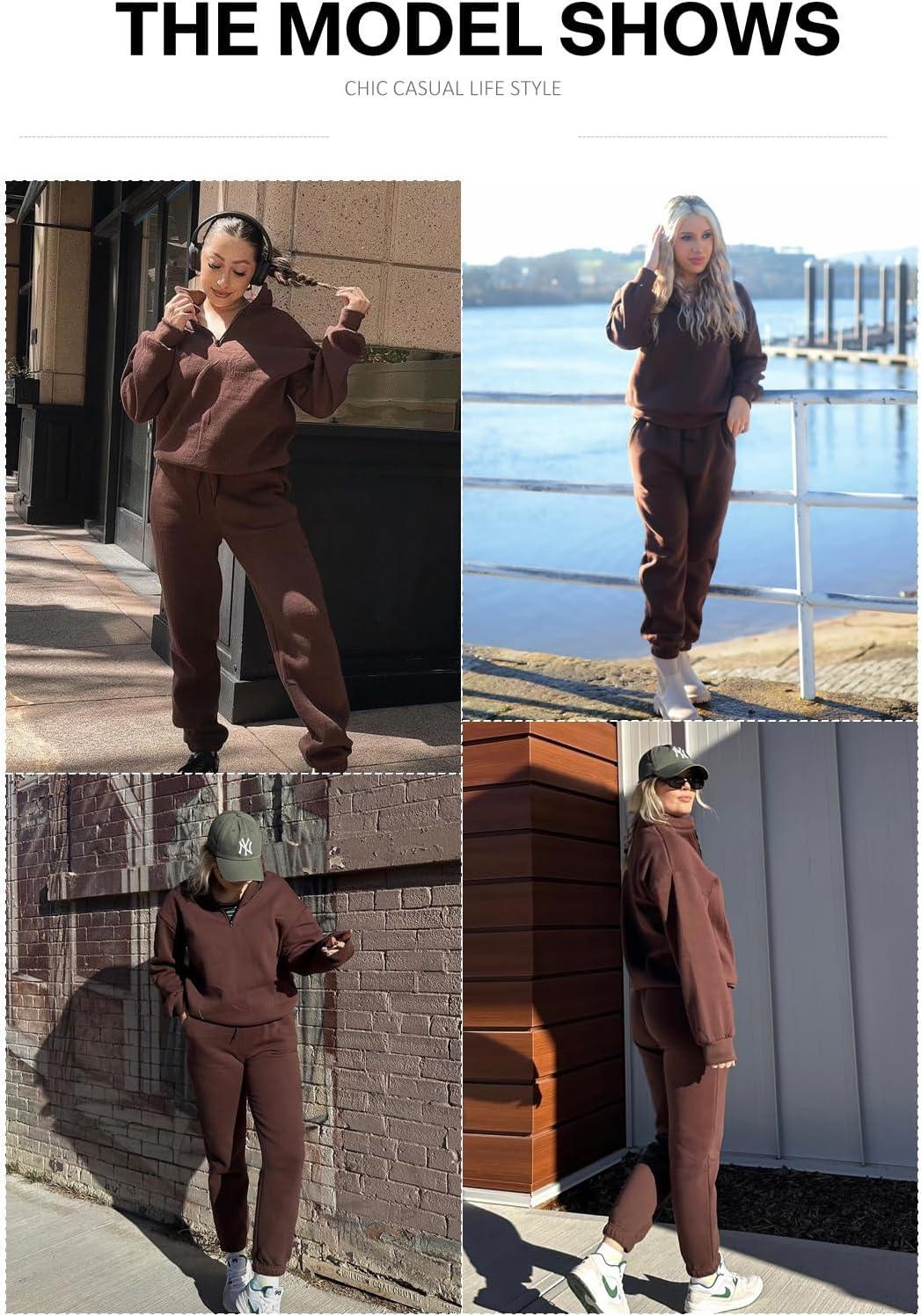 Aleumdr Women 2 Piece Outfits Sweatsuit Oversized Half Zip Pullover Long Sleeve Sweatshirt Jogger Pants Set with Pockets(Brown)