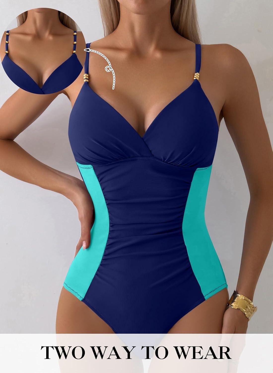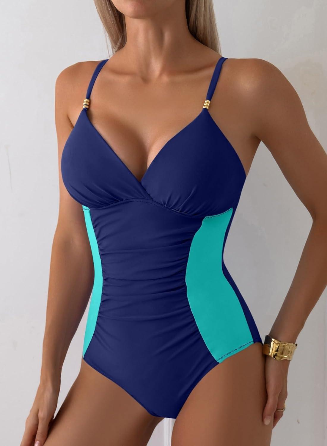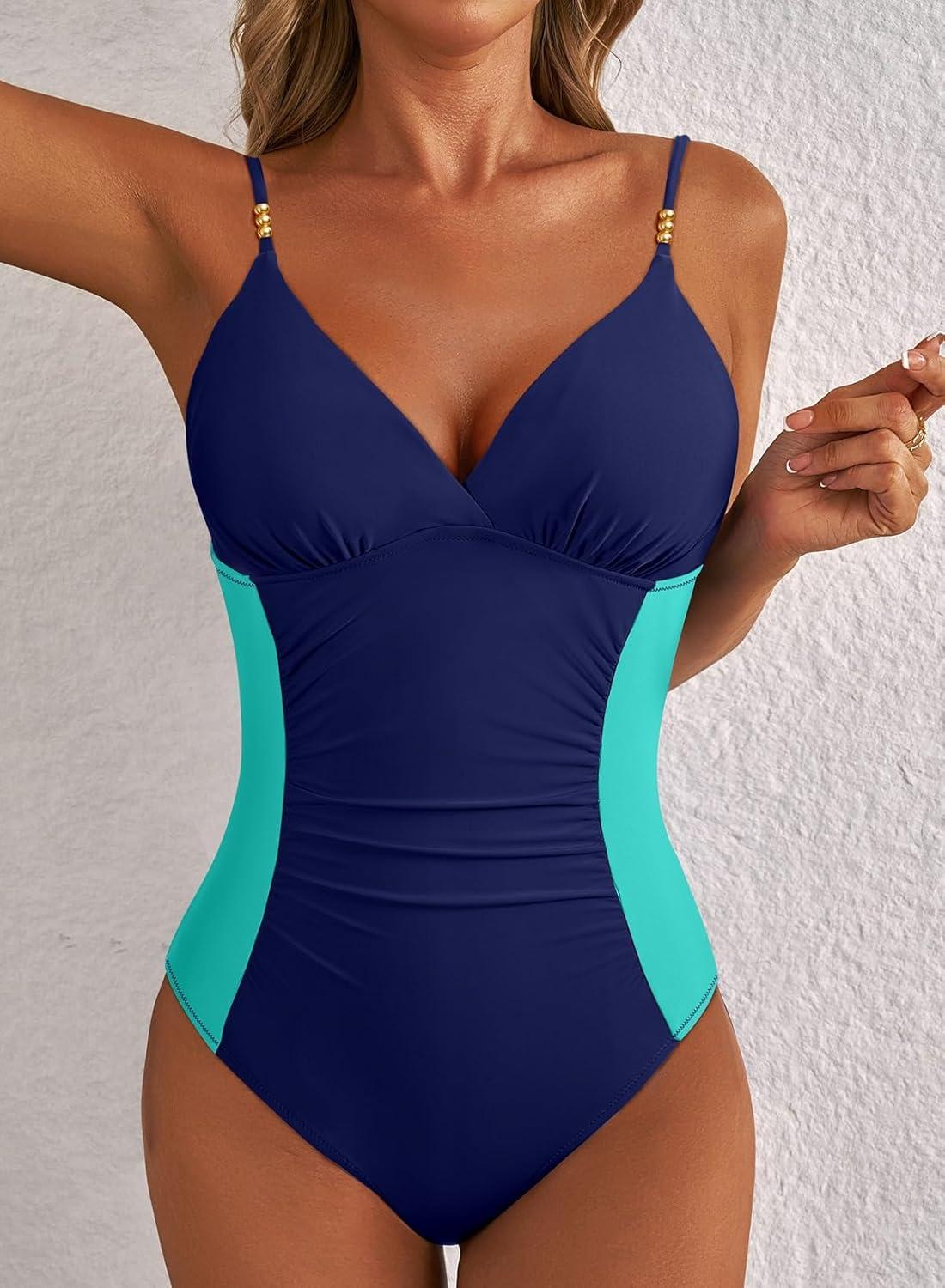 Aleumdr Women One Piece Swimsuit Tummy Control V Neck Ruched Bathing Suit Push Up Gold Metal Modest Slimming Swimwear(Navy Blue)