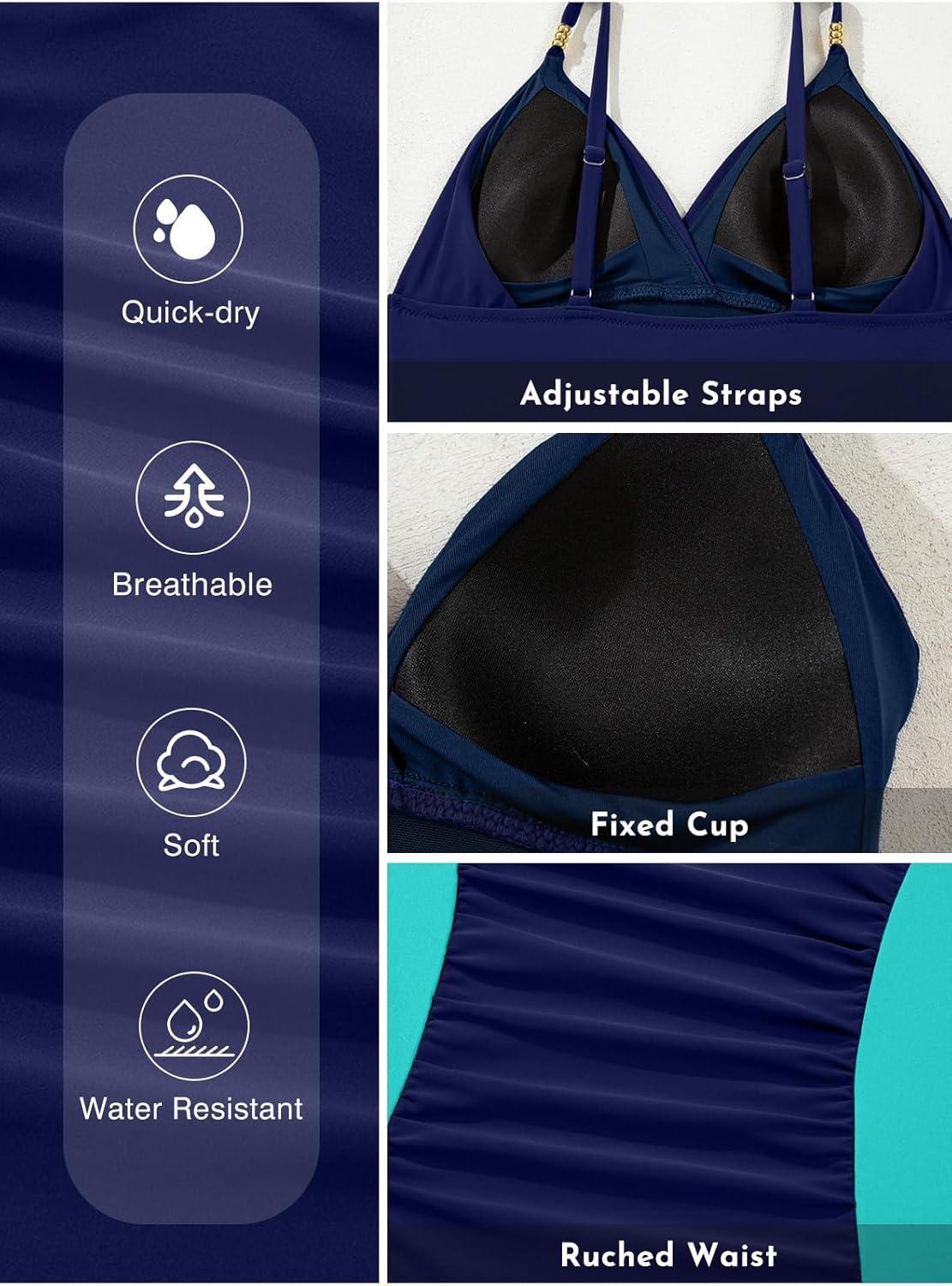 imageAleumdr Women One Piece Swimsuit Tummy Control V Neck Ruched Bathing Suit Push Up Gold Metal Modest Slimming SwimwearNavy Blue