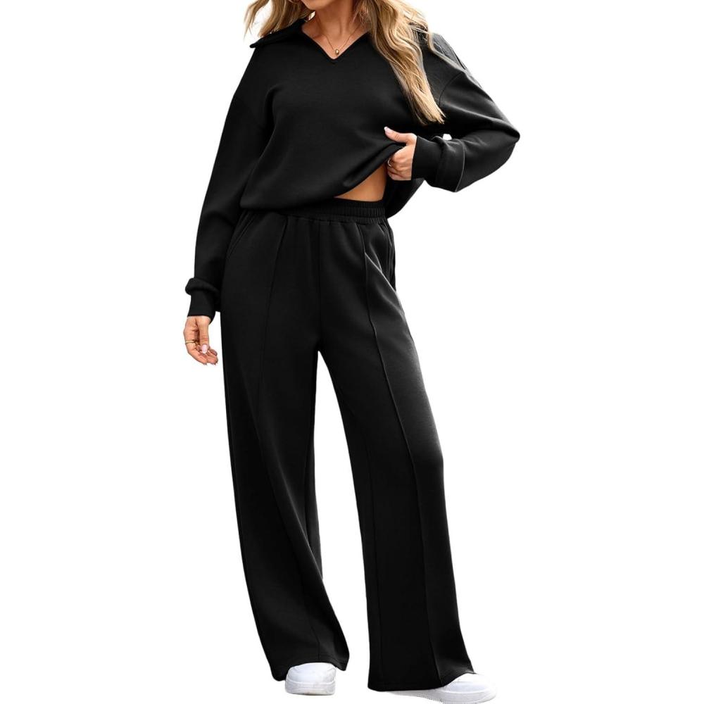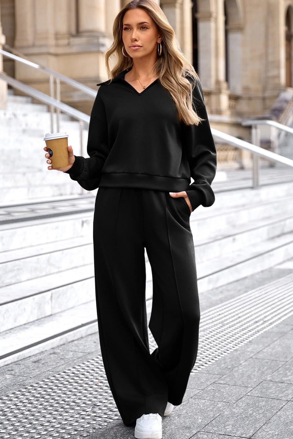 Aleumdr Womens 2 Piece Outfits Fall Lounge Set Sweatsuit Long Sleeve Tops Wide Leg Pants with Pockets Travel Outfit(Black)