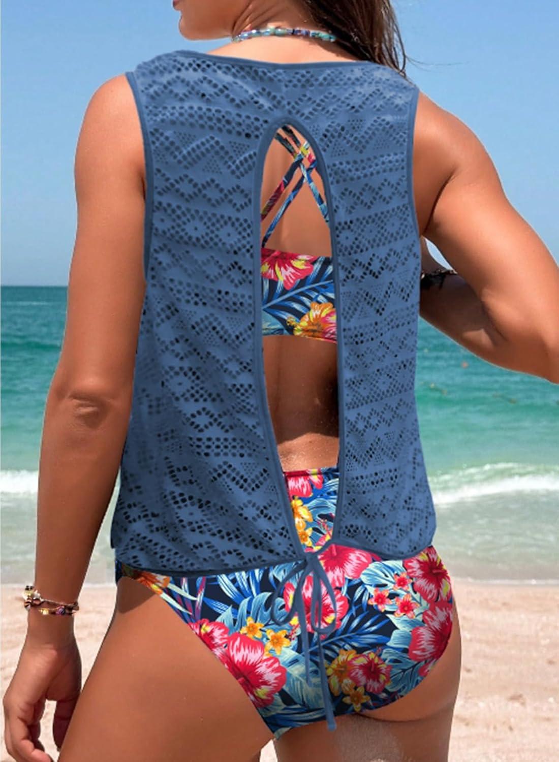 Aleumdr Womens Athletic 3 Piece Tankini Swimsuit with Shorts Tank Tops Bathing Suit with Bra Open Back Athletic Swimwear(Prussian Blue)