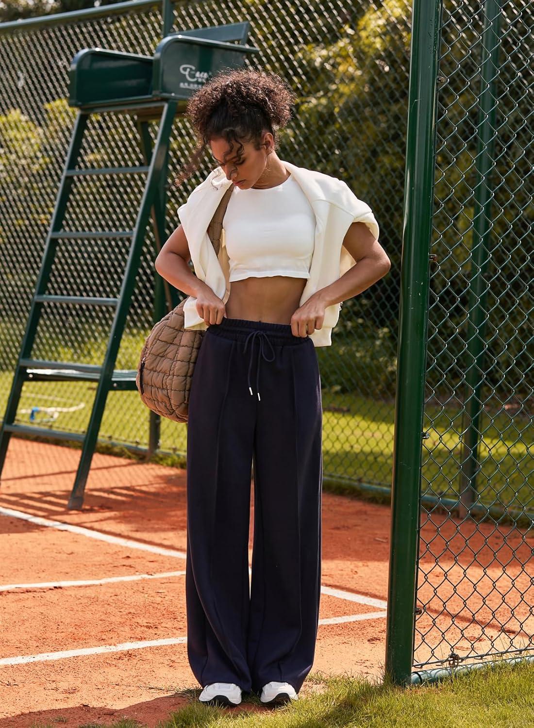 Aleumdr Women’s High Waisted Drawstring Waist Wide Leg Sweatpants with Pockets Casual Loose Yoga Pants(Lighter Weight Navy Blue)