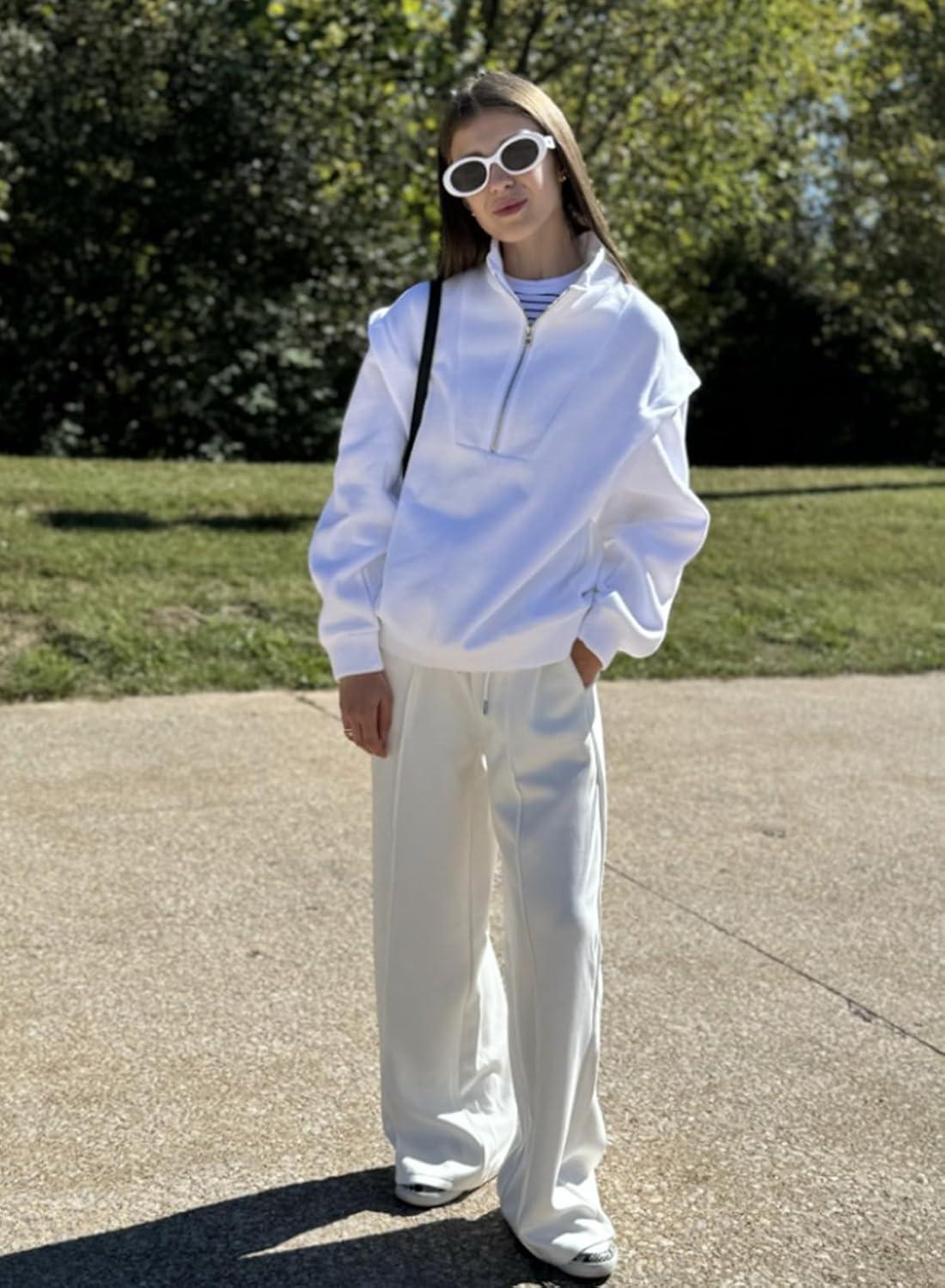Aleumdr Women’s High Waisted Drawstring Waist Wide Leg Sweatpants with Pockets Casual Loose Yoga Pants(White Leather Label)