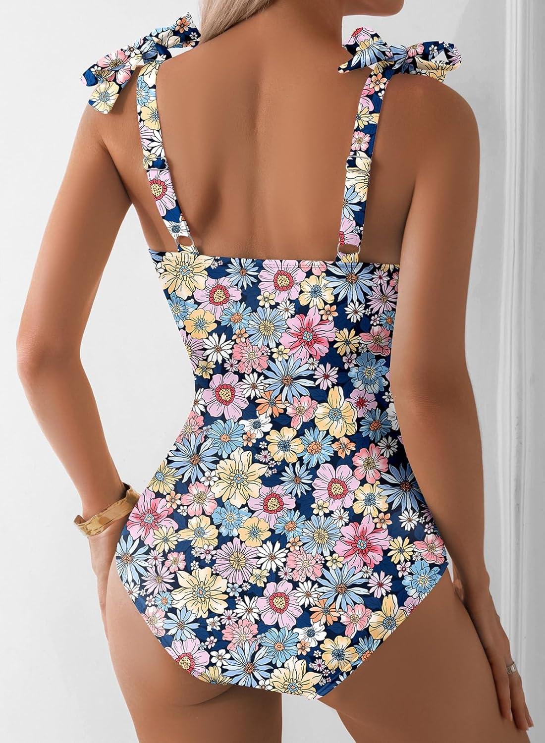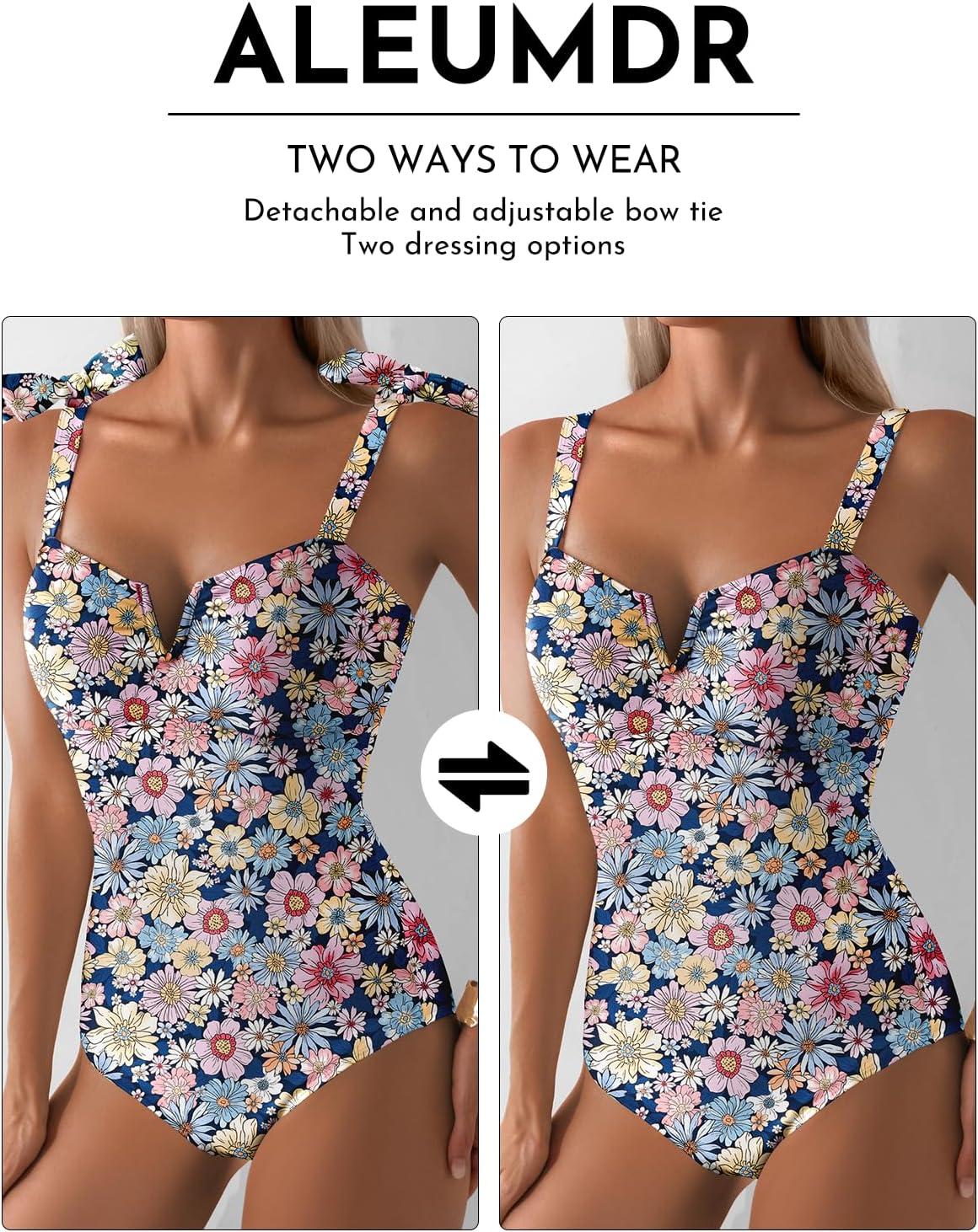 Aleumdr Women’s One Piece Swimsuits Tummy Control Bathing Suits V Neck Boho Tie Shoulder Ruched Full Coverage Swimwear(Yellow)