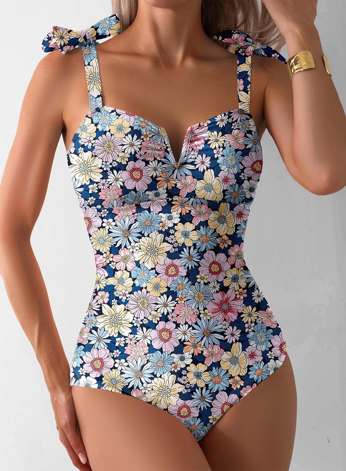 Aleumdr Women’s One Piece Swimsuits Tummy Control Bathing Suits V Neck Boho Tie Shoulder Ruched Full Coverage Swimwear(Sky Blue)