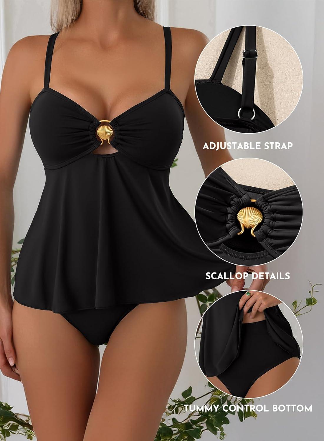 Aleumdr Women's Tankini Bathing Suits Bandeau 2 Piece Swimsuits Shell Swim Tank Top with High Waisted Bottom(Black)