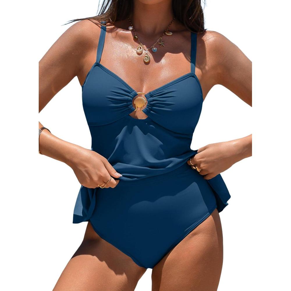 Aleumdr Women’s Tankini Bathing Suits Bandeau 2 Piece Swimsuits Shell Swim Tank Top with High Waisted Bottom(Sail Blue)