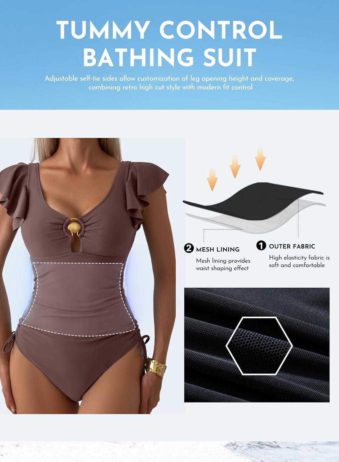Aleumdr Womens Tummy Control Swimsuit Ruffle Slimming One Piece Bathing Suit Cutout V Neck High Waist Swimwear(Coffee)