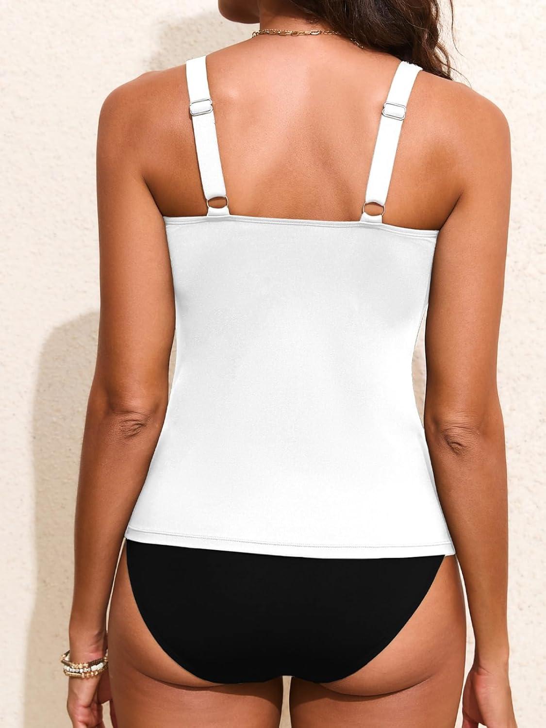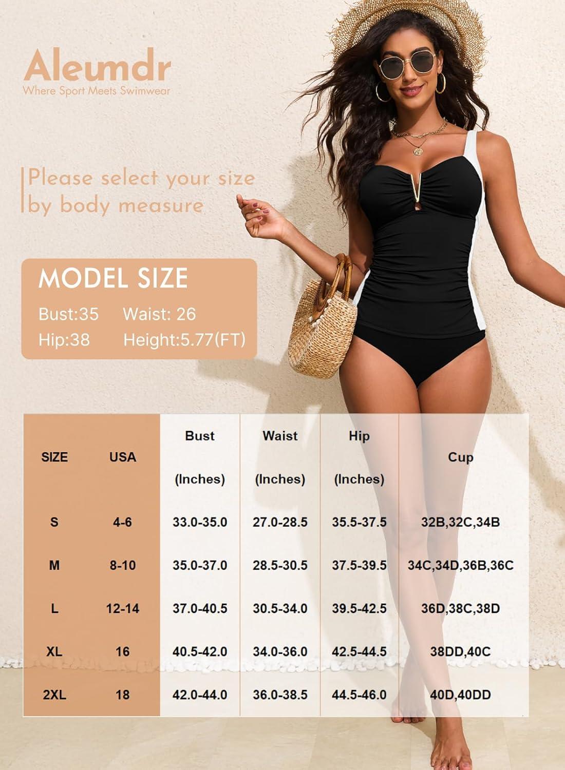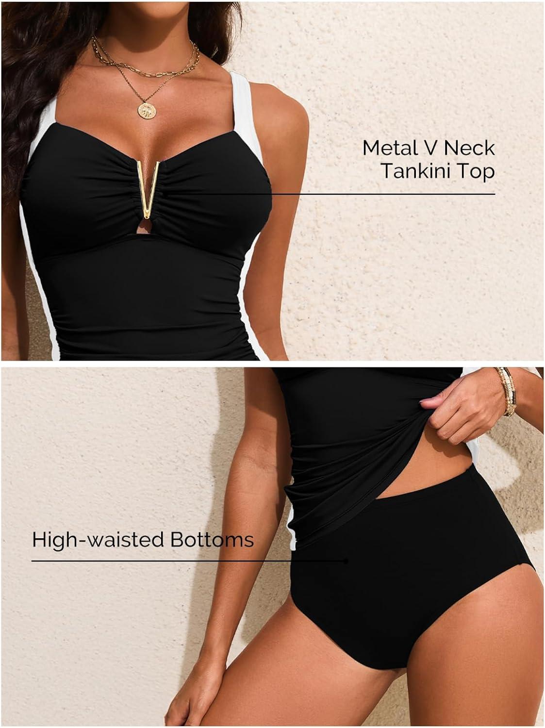 Aleumdr Women's V-Wire Tankini Sets Ruched Two Piece Swimsuit Bathing Suit Color Block Swim Tops with Bottoms(Black)